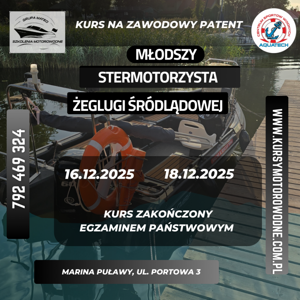 Kurs przygotowujący do egzaminu na zawodowy patent Młodszego Stermotorzysty Żeglugi Śródlądowej.
